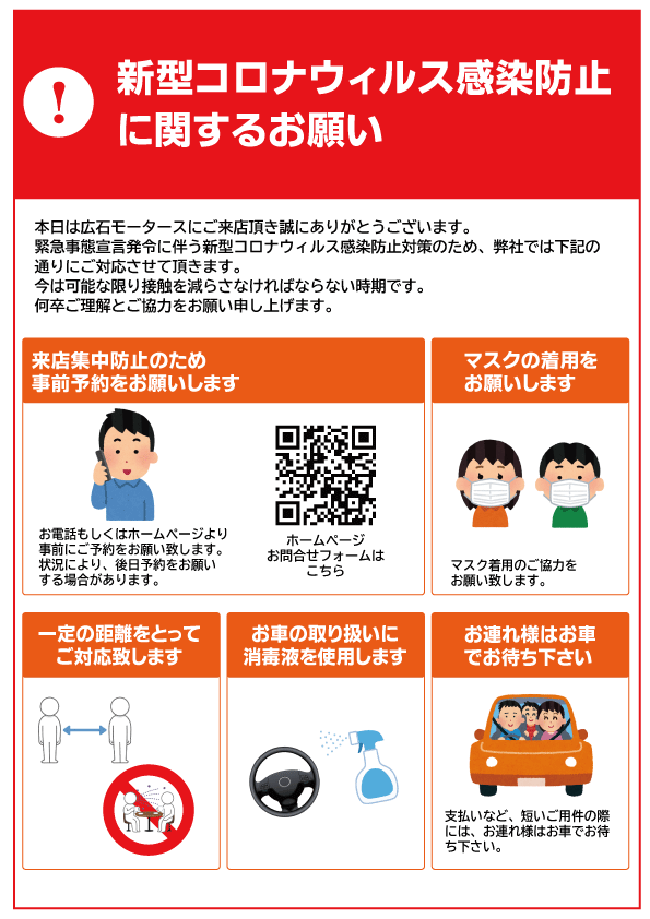 新型コロナウィルス感染予防のお願い 2020/04/18 広石モータースをご利用いただきありがとうございます。 静岡県も対象となる緊急事態宣言の発令に伴い、弊社でもより一層感染予防対策に注力して参りますので、恐れ入りますがご理解とご協力を賜りますようお願い申し上げます。 営業時間について 4月22日~27日の間 9:00~16:00 に短縮営業致します。 (2020年4月18日現在) 共有:シェア クリックして X で共有 (新しいウィンドウで開きます) X Facebook で共有するにはクリックしてください (新しいウィンドウで開きます) Facebook