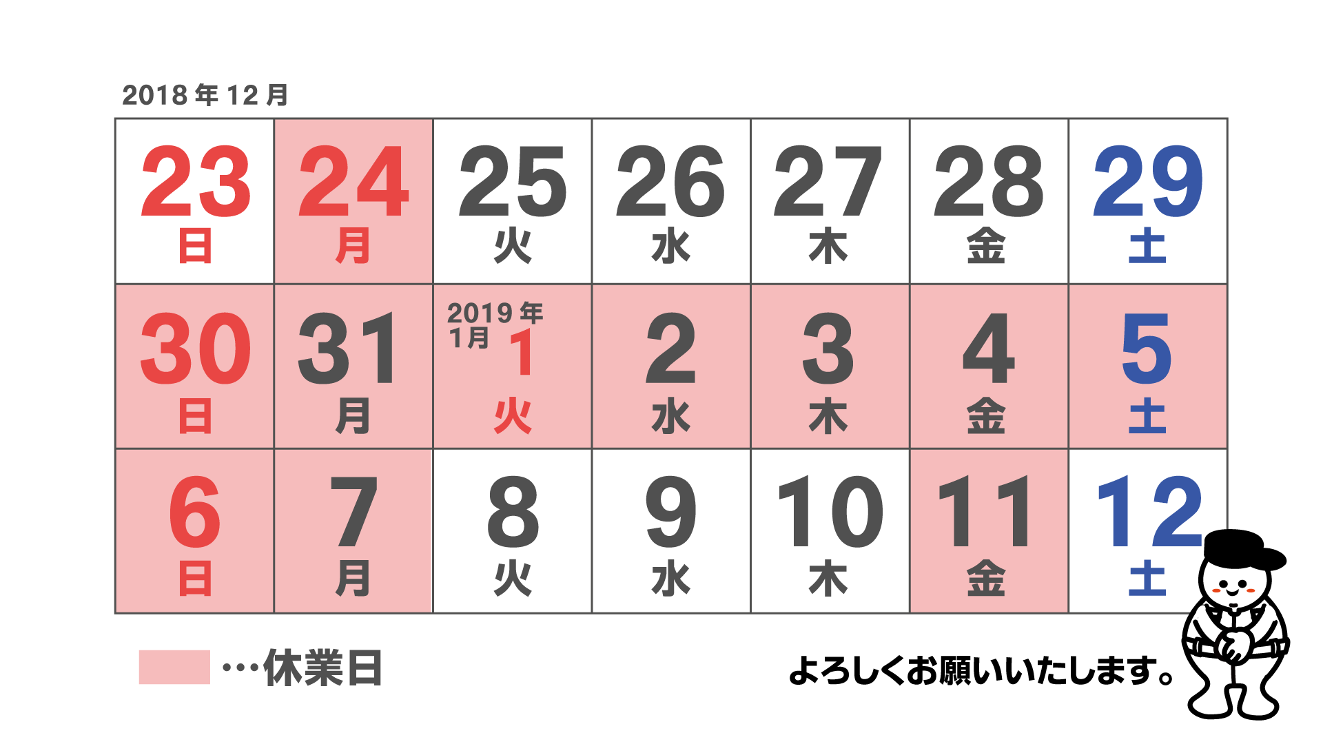 年末年始の営業予定は、以下のとおりとなります。