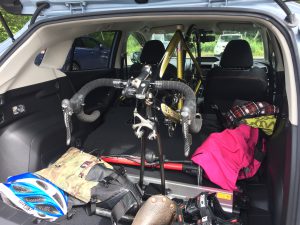 新型XVはインナーサイクルキャリヤは無くなってしまい(多分車内に二台並べるとバックゲートが閉まらない?)お店としてはイレギュラーな情報ですが旧XV用キャリヤを装着し自転車を中央にしてバックドア開閉可能な場所を探し積載しました。一台なら最高な積み方です(笑)キャリヤを固定する床板寸法が新旧一緒でしたので固定は問題ありませんでした。