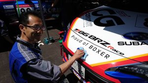 レース前にSUBARUだるまにそれぞれドライバー自ら片目を入れて、挑んだよ!