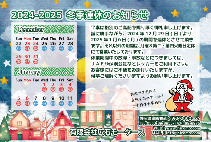 2024-2025 冬季連休のおしらせ 2024/12/18 平素は格別のご高配を賜り厚く御礼申し上げます。誠に勝手ながら、2024年12月29日(日)より2025年1月6日(月)の期間を連休とさせて頂きます。それ以外の期間は、月曜&第二・第四火曜日定休にて営業いたしております。休業期間中の故障・事故などにつきましては、JAFや保険会社などレッカーをご利用下さい。お客様にはご不便をお掛けいたしますが、何卒ご理解くださいますようお願い申し上げます。 共有:シェア クリックして X で共有 (新しいウィンドウで開きます) X Facebook で共有するにはクリックしてください (新しいウィンドウで開きます) Facebook